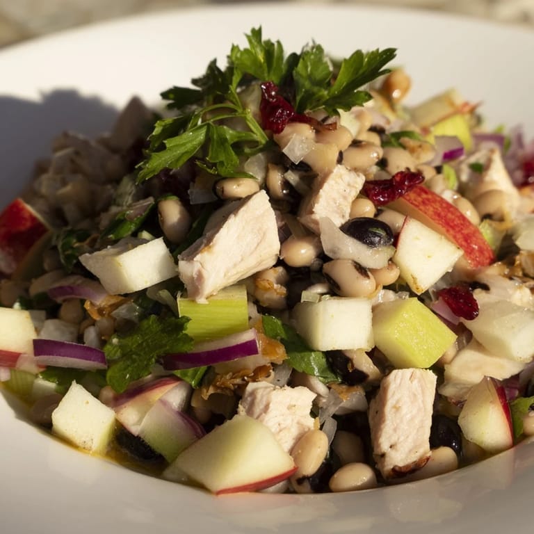 Save New Year's Eve, I stood in my kitchen watching the clock tick toward midnight, suddenly aware I'd promised to bring something nourishing to a potluck the next morning. My grandmother's voice echoed in my head about black-eyed peas bringing luck, so I started roasting chicken and hunting through my pantry. What emerged was this salad—crisp apples meeting tender chicken, those little black-eyed peas doing their job, all bound together with a honey-mustard dressing that somehow tasted like both comfort and celebration.