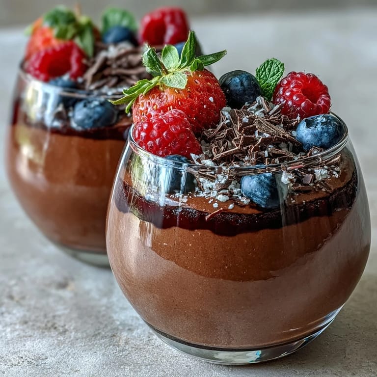 The mousse keeps beautifully in the refrigerator for up to two days if you cover it, and actually firms up slightly over time, which some people prefer. I always add the berries at the last moment because they'll weep if they sit in the mousse, but the chocolate base is completely stable and even improves as flavors settle. This makes it perfect for meal prep or having something ready when unexpected guests show up.