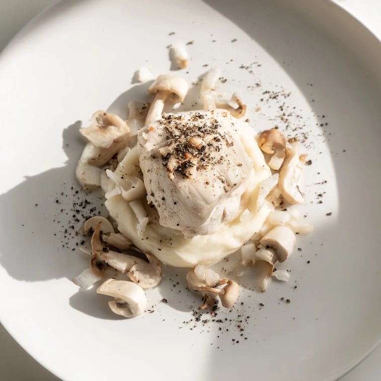 If chicken isn't in your future, thick slices of roasted celeriac or firm tofu can stand in beautifully, poached in vegetable broth to keep everything in the white family. You can also infuse the chicken broth with a crushed garlic clove or a bay leaf for extra aroma—just make sure the liquid stays clear so the visual promise doesn't break. Trust your instincts; this dish is forgiving as long as you respect the philosophy: pale, delicate, and finished with that dramatic shadow.