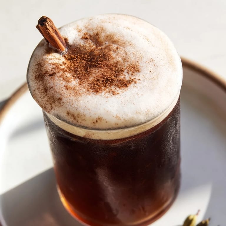 - Fill glasses with ice, pour concentrate until two-thirds full, then crown with a generous spoonful of foam. The contrast of cold spiced drink with creamy top is the entire appeal—don't skimp on the foam.
