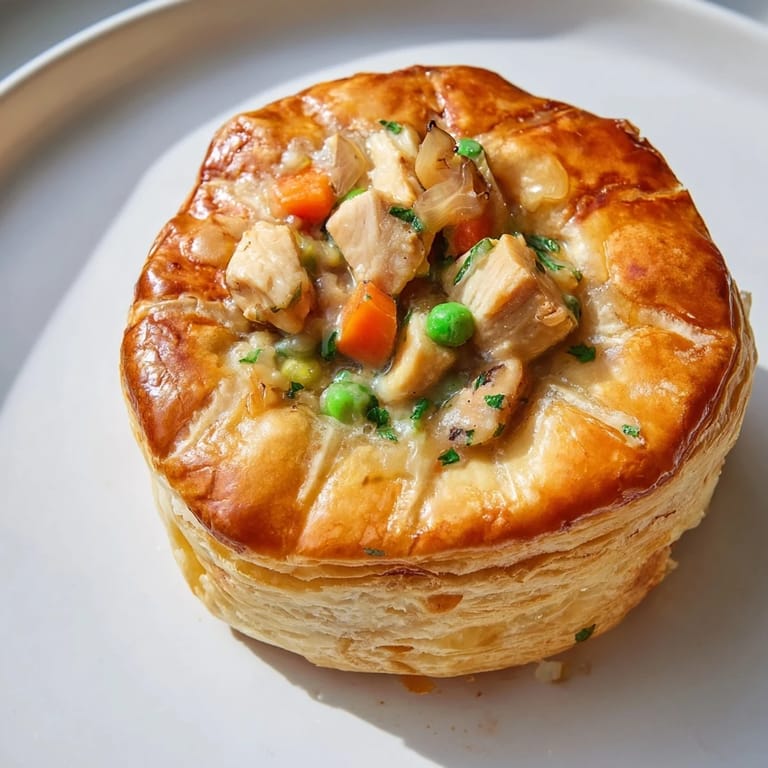 Save A rustic, comforting chicken pot pie infused with aromatic bay leaf and fresh herbs, nestled beneath a golden, flaky pastry crust. Perfect for cozy dinners and family gatherings.