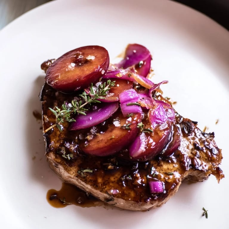 Save Tender pork chops simmered with juicy plums and aromatic herbs, finished with a rich balsamic glaze. A fruit-forward, comforting skillet dinner perfect for cozy evenings.