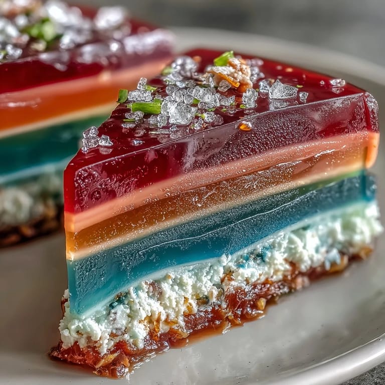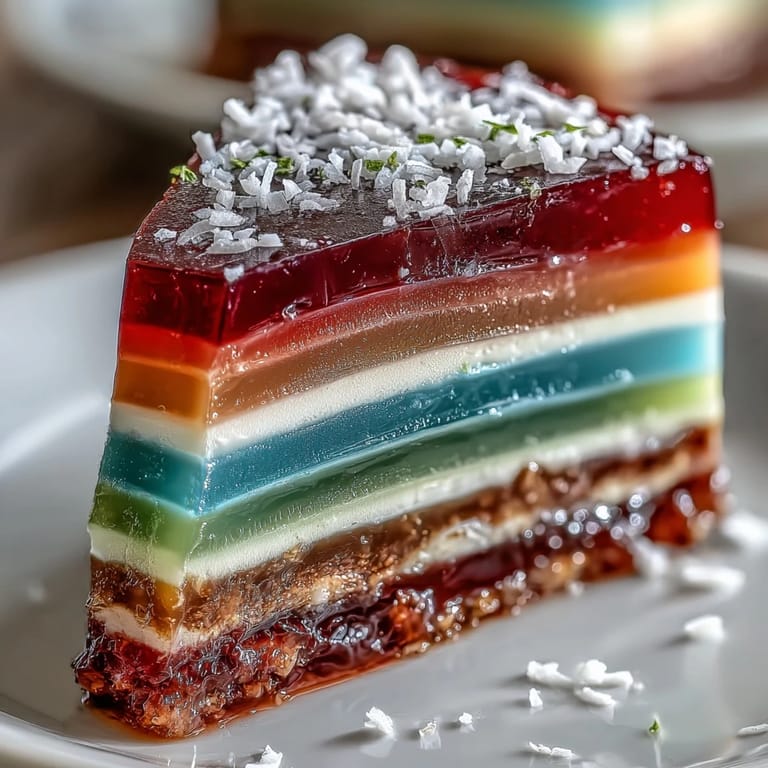 Save An unexpected craving for something cheerful led me to create this Rainbow Jelly Cake one humid afternoon, the curtains casting colored stripes across my kitchen. I remember the gentle fizz of agar-agar simmering and the way the scent of sweet coconut floated through the room. Every layer turned into a conversation with myself about color, patience, and a little bit of play. As the cake chilled, it became a centerpiece as much for its vibrant look as its bouncy, creamy promise. Making it felt oddly meditative—even if I did end up with food coloring on nearly every fingertip.