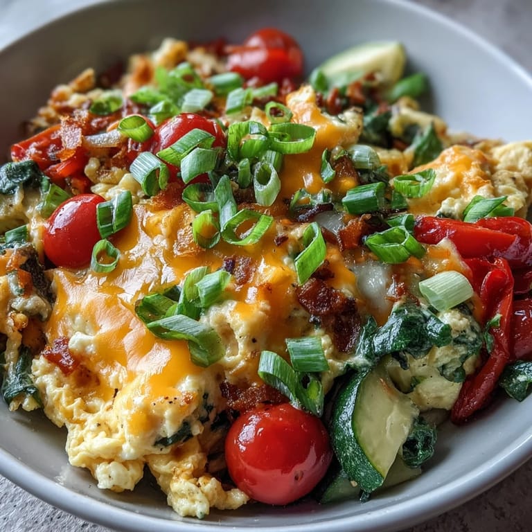 Save There's something about the sound of eggs hitting a hot buttered skillet that just signals morning is happening. I stumbled onto this bowl one Tuesday when I had vegetables wilting in my crisper drawer and exactly four eggs left, no plan whatsoever. The cheese melted into those soft curds, the spinach gave it this unexpected earthiness, and suddenly breakfast felt less like obligation and more like actually taking care of myself for once.