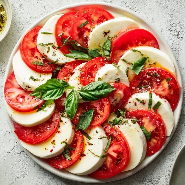 Save A fresh and vibrant brunch side featuring juicy tomatoes and creamy mozzarella, finished with fragrant basil and a drizzle of olive oil.