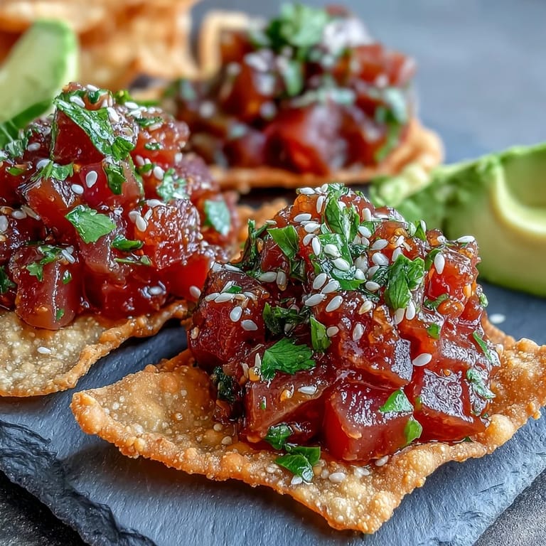 Once I mastered the wonton chips, I realized they're one of those components that elevates everything around them because they provide texture and a crispy canvas for the creamy tartare. I've experimented with frying them at different temperatures—too cool and they're greasy, too hot and they burn—and now I use a tiny piece of wrapper as a temperature test before committing the whole batch. The moment they hit the hot oil, there's this wonderful sizzle and within seconds they're golden and ready to drain.