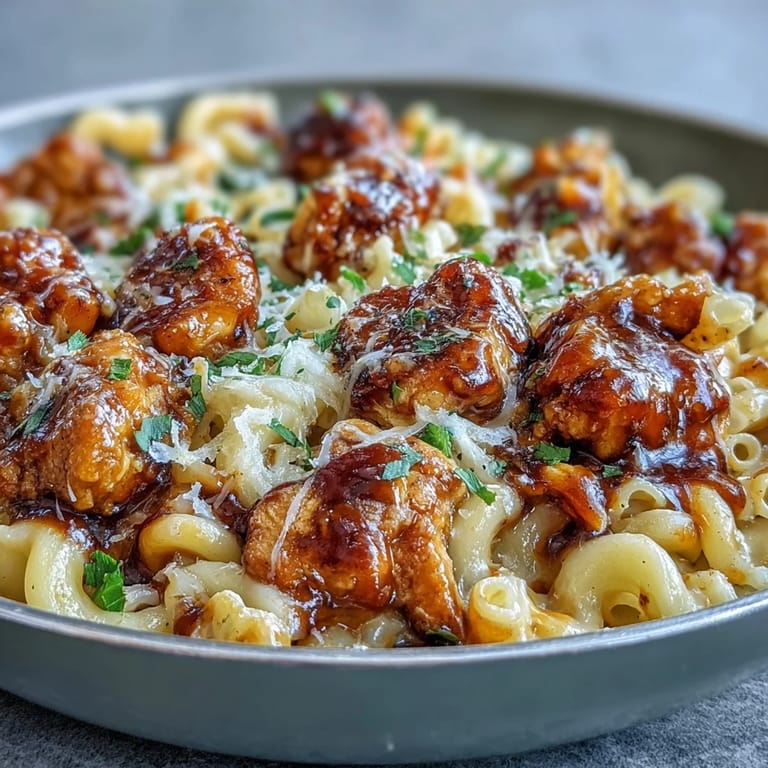 The first time I made this for my sister and her husband, I was honestly nervous about the honey BBQ glaze—worried it'd be too sweet or burn on the bottom. But the way it coated those chicken bites and then mingled with the cheese sauce created this unexpectedly complex flavor that everyone kept coming back for seconds about. My brother-in-law asked for the recipe right there at the table, which felt like the highest compliment possible.
